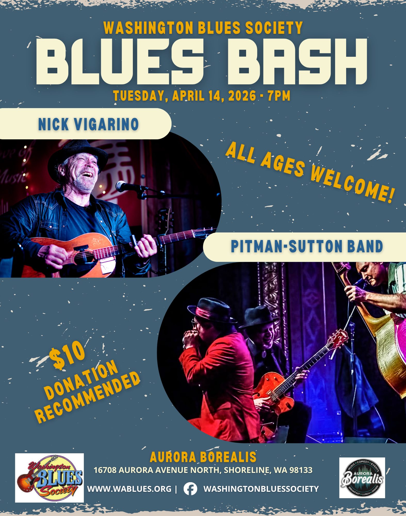 Doors 7pm | $10 Suggested Donation | All Ages Join us for the Washington Blues Society monthly Blues Bash! Music from Nick Vigarino and Pitman-Sutton Band! Raffles and Door Prizes!! |